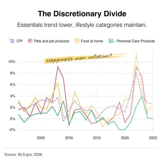 However, when stretched across 25 years, the long-term picture is more measured. According to the chart, $20 spent on pet products in 2001 would cost approximately $32.80 today. Under headline CPI, that same $20 would cost roughly $36.28.