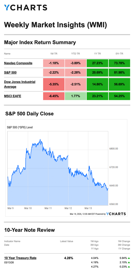 YCharts.com, March 14, 2026. Weekly performance is measured from Monday, March 9 to Friday, March 13.